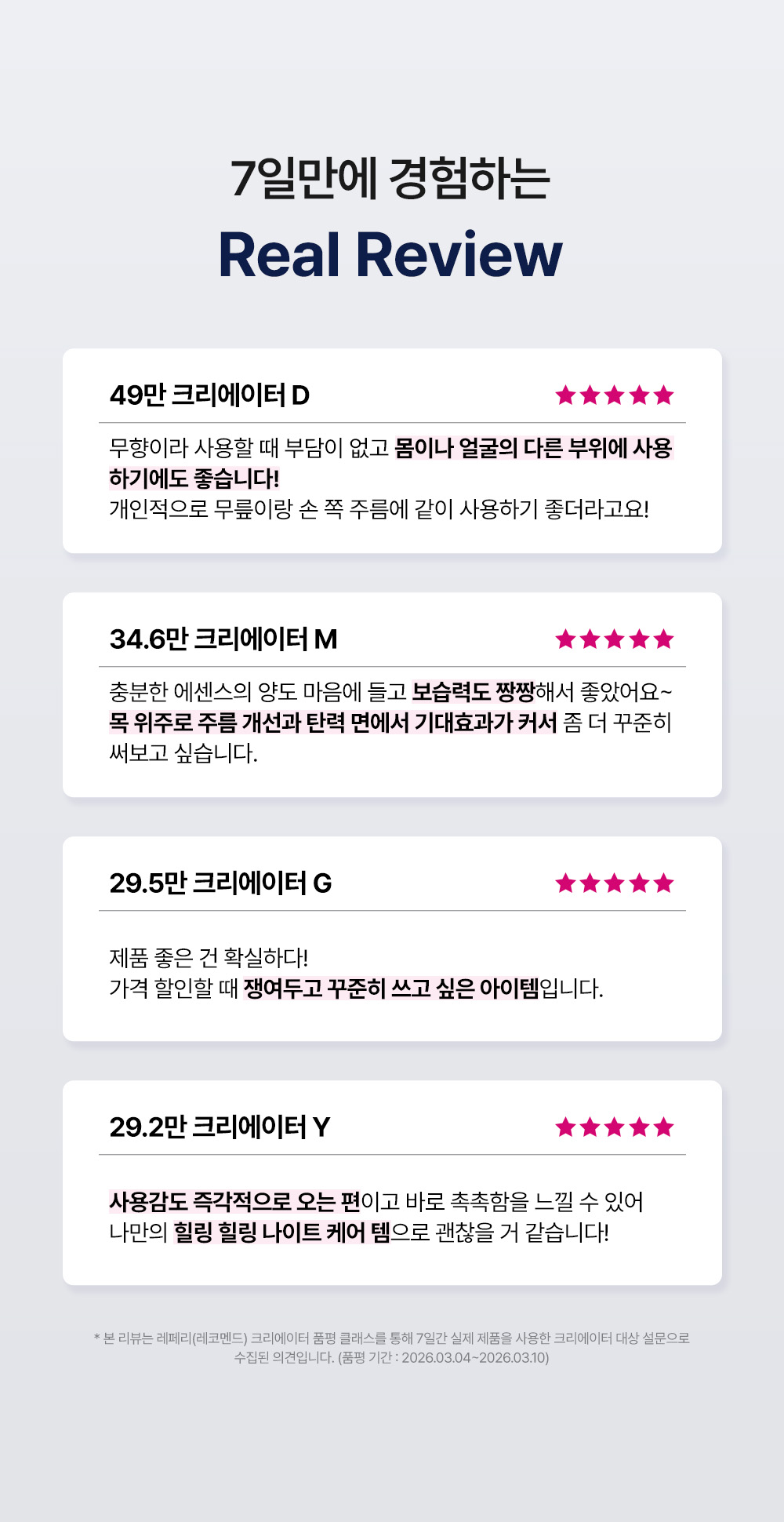 정제수, 다이프로필렌글라이콜, 글리세린, 세틸에틸헥사노에이트, 1,2-헥산다이올, 메틸프로판다이올, 글리세레스-26, 하이드록시아세토페논, 다이펜타에리스리틸헥사C5-9애씨드에스터, 스쿠알란, 글리세릴스테아레이트, 폴리글리세릴-3메틸글루코오스다이스테아레이트, 폴리글리세릴-10라우레이트, 메틸글루세스-20, 아크릴레이트/C10-30알킬아크릴레이트크로스폴리머, 프로판다이올, 판테놀, 에틸헥실글리세린, 알지닌, 베타인, 트레할로오스, 호호바씨오일, 잔탄검, 하이드롤라이즈드해면, 부틸렌글라이콜, 다이포타슘글리시리제이트, 하이드록시에틸셀룰로오스, 동백나무꽃추출물, 소듐하이알루로네이트, 글리세릴아크릴레이트/아크릴릭애씨드코폴리머, 피브이엠/엠에이코폴리머, 쇠비름추출물, 병풀추출물, 아데노신, 하이드롤라이즈드하이알루로닉애씨드, 마데카소사이드, 펜틸렌글라이콜, 사이아노코발아민, 글루타티온, 소듐아세틸레이티드하이알루로네이트, 소듐하이알루로네이트크로스폴리머, 히스티딘, 프롤린, 페닐알라닌, 트립토판, 트레오닌, 타이로신, 알라닌, 아이소류신, 아스파틱애씨드, 아스파라진, 시스틴, 소듐아스코빌포스페이트, 세린, 발린, 메티오닌, 류신, 라이신, 나이아신아마이드, 글루타민, 글루타믹애씨드, 글라이신, 카퍼트라이펩타이드-1, 아세틸헥사펩타이드-8, 팔미토일펜타펩타이드-4, 아시아틱애씨드, 아시아티코사이드, 마데카식애씨드, 하이알루로닉애씨드, 하이드롤라이즈드소듐하이알루로네이트, 팔미토일트라이펩타이드-1, 팔미토일테트라펩타이드-7, 올리고펩타이드-29, 올리고펩타이드-32, 우라실, 아데닌, 사이토신, 메나다이온, 구아닌, 피리독신, 폴릭애씨드, 티아민에이치씨엘, 아스코빅애씨드, 바이오틴, 리보플라빈
