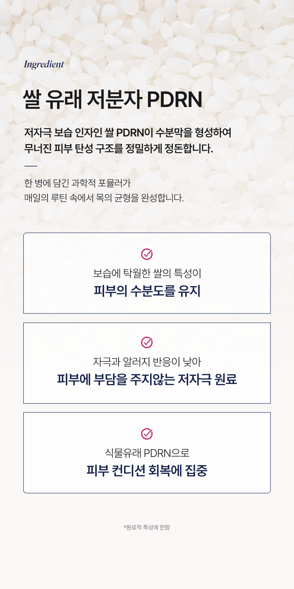 정제수, 글리세린, 카프릴릭/카프릭트라이글리세라이드, 해바라기씨오일, 나이아신아마이드, 세테아릴알코올, 1,2-헥산다이올, 미네랄워터, 세테아릴올리베이트, 부틸렌글라이콜, 메틸트라이메티콘, 오일팜커넬오일, 솔비탄올리베이트, 오일팜오일, 에틸헥실글리세린, 알란토인, 잔탄검, 알지닌, 스쿠알란, 암모늄아크릴로일다이메틸타우레이트/브이피코폴리머, 카보머, 아데노신, 펜틸렌글라이콜, 글루타티온, 소듐하이알루로네이트, 글라이신, 글루타믹애씨드, 글루타민, 라이신, 류신, 메티오닌, 발린, 세린, 소듐아스코빌포스페이트, 시스틴, 아스파라진, 아스파틱애씨드, 아이소류신, 알라닌, 타이로신, 트레오닌, 트립토판, 페닐알라닌, 프롤린, 히스티딘, 소듐하이알루로네이트크로스폴리머, 소듐파이테이트, 카퍼트라이펩타이드-1, 하이드롤라이즈드하이알루로닉애씨드, 토코페롤, 아세틸헥사펩타이드-8, 팔미토일펜타펩타이드-4, 하이알루로닉애씨드, 소듐디엔에이, 팔미토일테트라펩타이드-7, 팔미토일트라이펩타이드-1, 구아닌, 메나다이온, 사이토신, 아데닌, 우라실, 하이드롤라이즈드소듐하이알루로네이트, 리보플라빈, 바이오틴, 사이아노코발아민, 아스코빅애씨드, 티아민에이치씨엘, 폴릭애씨드, 피리독신