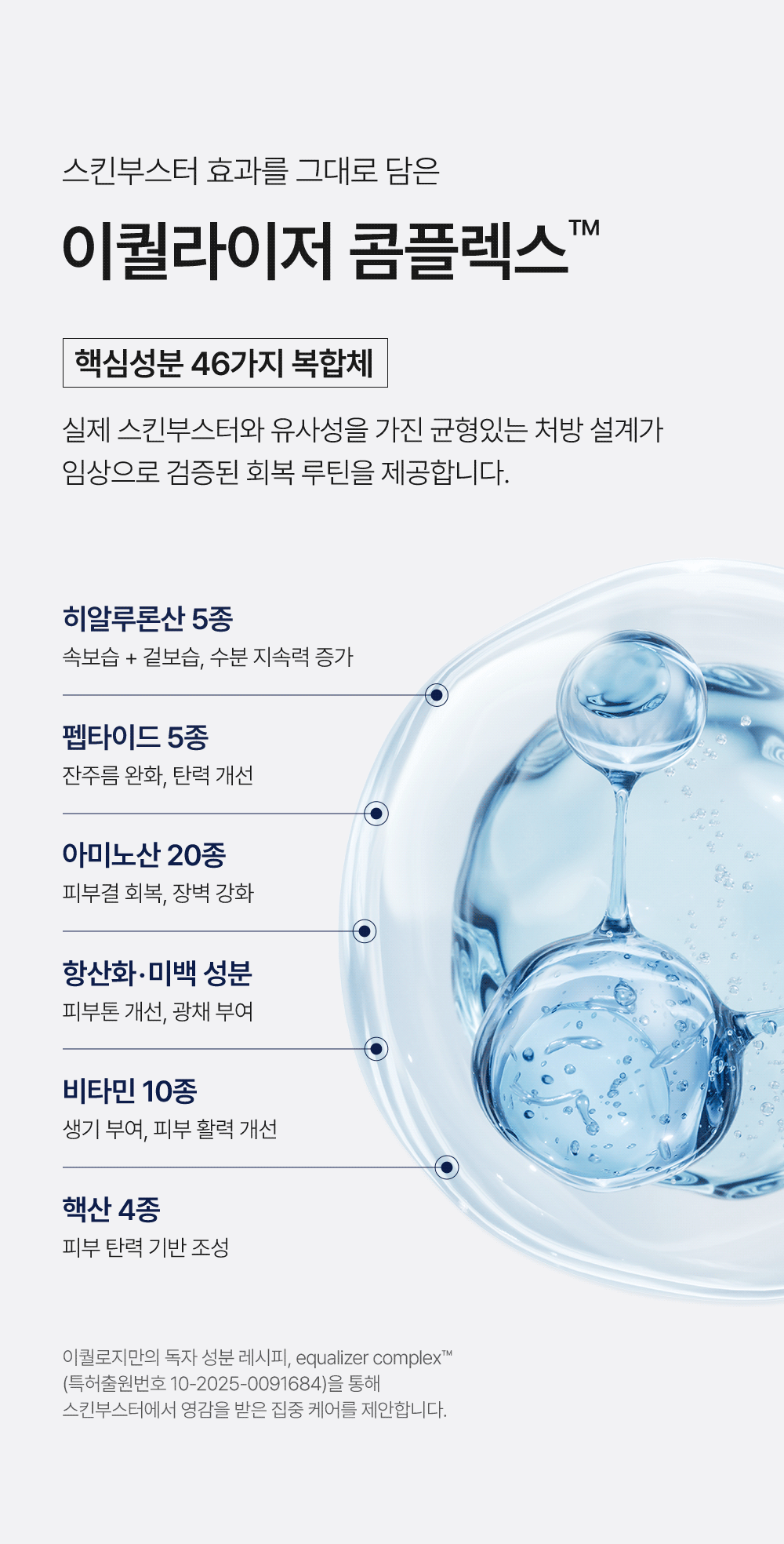 정제수, 다이프로필렌글라이콜, 글리세린, 세틸에틸헥사노에이트, 1,2-헥산다이올, 메틸프로판다이올, 글리세레스-26, 하이드록시아세토페논, 다이펜타에리스리틸헥사C5-9애씨드에스터, 스쿠알란, 글리세릴스테아레이트, 폴리글리세릴-3메틸글루코오스다이스테아레이트, 폴리글리세릴-10라우레이트, 메틸글루세스-20, 아크릴레이트/C10-30알킬아크릴레이트크로스폴리머, 프로판다이올, 판테놀, 에틸헥실글리세린, 알지닌, 베타인, 트레할로오스, 호호바씨오일, 잔탄검, 하이드롤라이즈드해면, 부틸렌글라이콜, 다이포타슘글리시리제이트, 하이드록시에틸셀룰로오스, 동백나무꽃추출물, 소듐하이알루로네이트, 글리세릴아크릴레이트/아크릴릭애씨드코폴리머, 피브이엠/엠에이코폴리머, 쇠비름추출물, 병풀추출물, 아데노신, 하이드롤라이즈드하이알루로닉애씨드, 마데카소사이드, 펜틸렌글라이콜, 사이아노코발아민, 글루타티온, 소듐아세틸레이티드하이알루로네이트, 소듐하이알루로네이트크로스폴리머, 히스티딘, 프롤린, 페닐알라닌, 트립토판, 트레오닌, 타이로신, 알라닌, 아이소류신, 아스파틱애씨드, 아스파라진, 시스틴, 소듐아스코빌포스페이트, 세린, 발린, 메티오닌, 류신, 라이신, 나이아신아마이드, 글루타민, 글루타믹애씨드, 글라이신, 카퍼트라이펩타이드-1, 아세틸헥사펩타이드-8, 팔미토일펜타펩타이드-4, 아시아틱애씨드, 아시아티코사이드, 마데카식애씨드, 하이알루로닉애씨드, 하이드롤라이즈드소듐하이알루로네이트, 팔미토일트라이펩타이드-1, 팔미토일테트라펩타이드-7, 올리고펩타이드-29, 올리고펩타이드-32, 우라실, 아데닌, 사이토신, 메나다이온, 구아닌, 피리독신, 폴릭애씨드, 티아민에이치씨엘, 아스코빅애씨드, 바이오틴, 리보플라빈